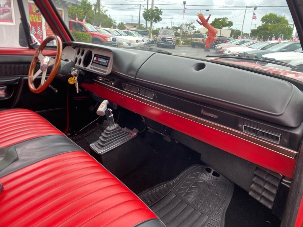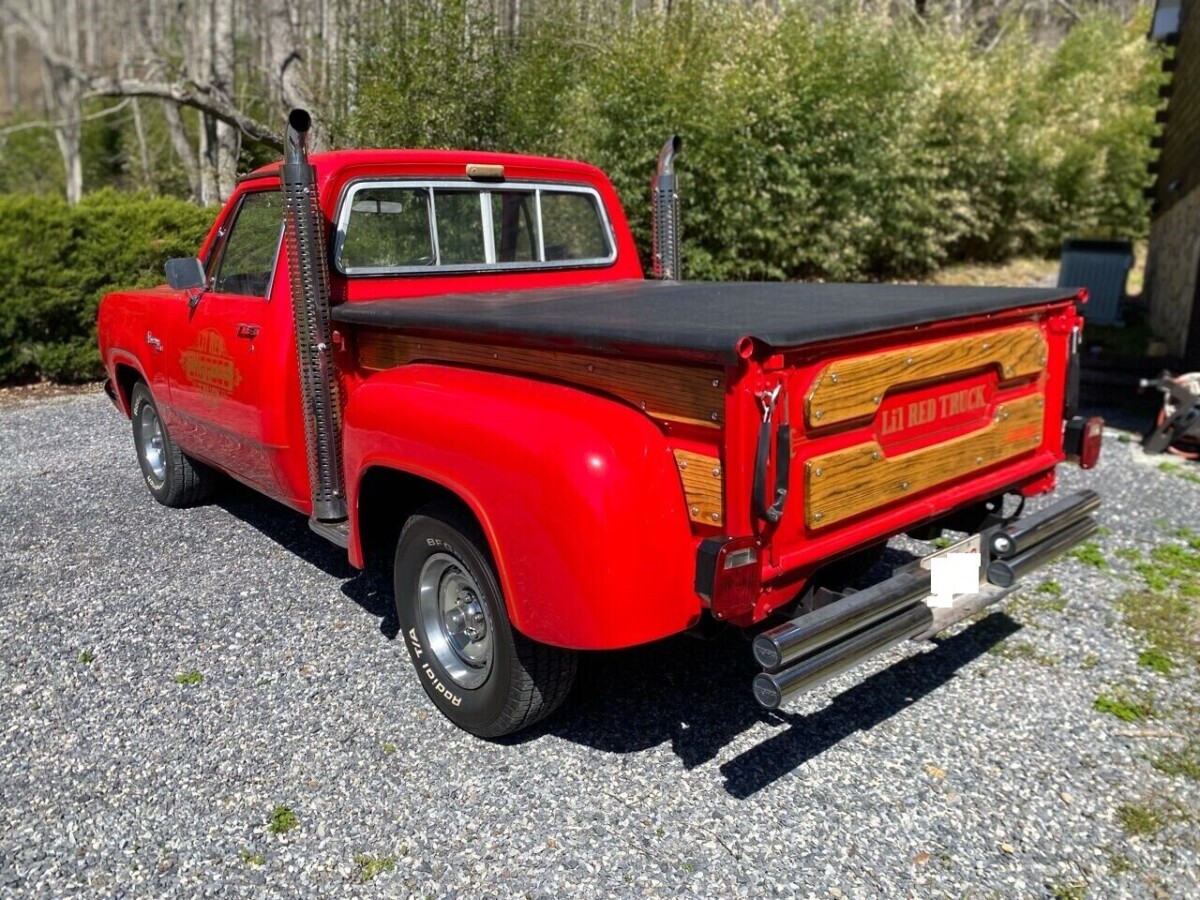 Wrong rear bumper, no pin striping on fenders, missing front hood emblem in chrome “DODGE”, wrong steering wheel, seat upholstery, the tray under the dash on the LH side?, floor shifter?, AC vents ( only 13 Lil Red were sold with AC! ), wrong door panels ( should have wood grain inserts ),missing rubber hoses to feed the carb air cleaner, missing rubber splash panels from frame to engine. I believe the underside of the dash should be painted black, not red. Tonneau cover and support is aftermarket. Wrong rims – nearly impossible to find them.. This is a nice truck, and they are cool to drive, sound great, etc. If buying as a “Show Winner”, there is likely some fun to be had to correct the non stock stuff here. If it’s truly a factory AC truck, wow.. All Lil Red’s started with the Adventurer package, that had the wood grain inserts on doors, dash, and on the seats themselves. The new owner will have fun with it!