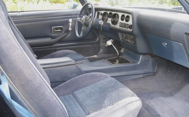 While black is perhaps the most sought-after color for a T/A nearer the end of this era, the Light Blue Metallic here is a classy choice, and it also works well on the Firebird body. Not surprisingly, this one still has its original paint, and having been stored inside has undoubtedly helped to preserve the exterior. Although the owner has put fewer than 5,000 miles on this car over the last 43 years, he did add a few custom touches early on, such as pinstriping, a rear window louver, and flares behind the wheelwells. A few minor dings and scrapes are noted, but they are all reported to have occurred during the decades while the car was stored in the owner’s garage.