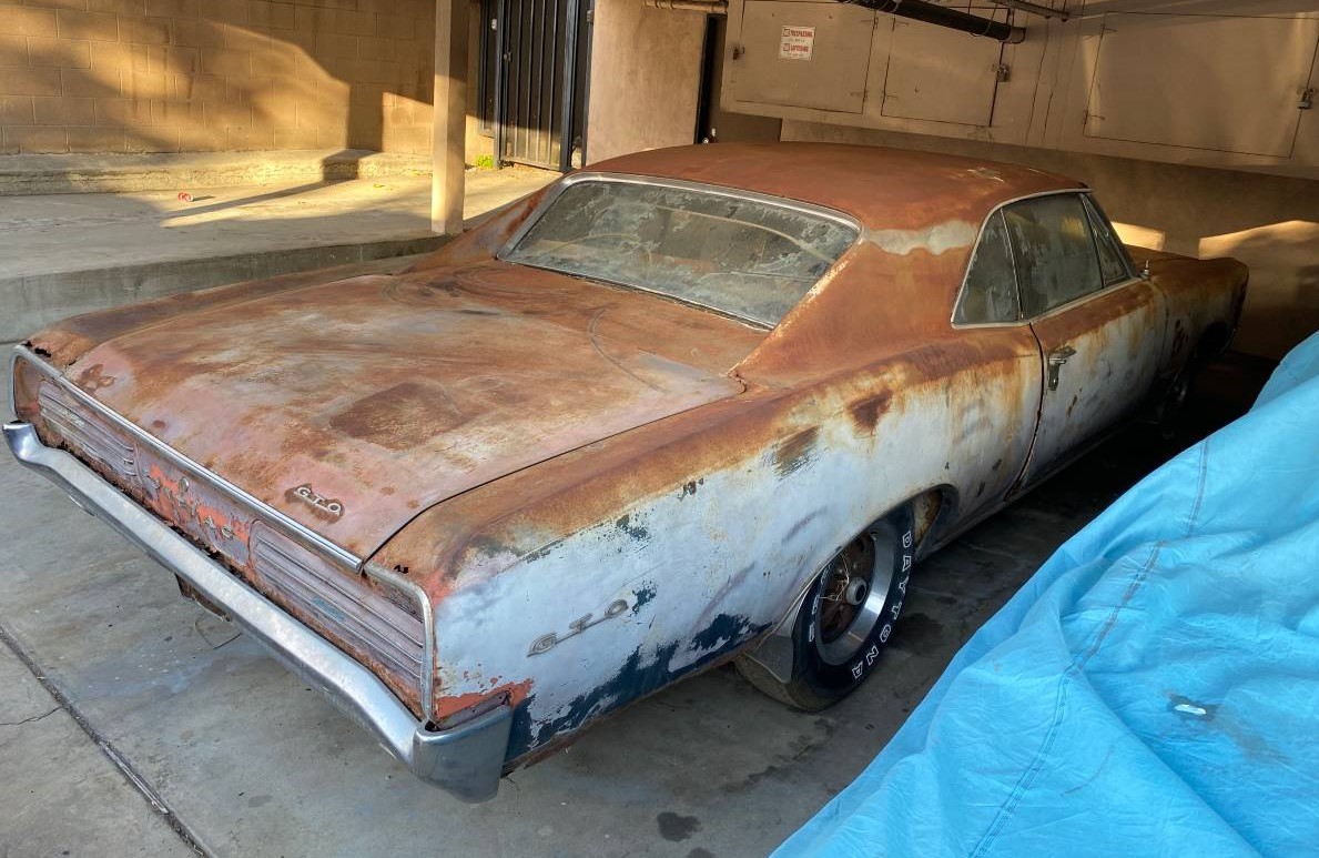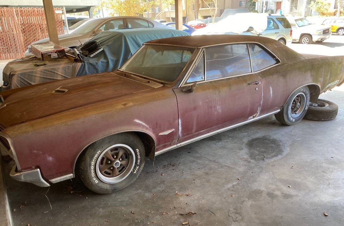The Pontiac GTO is generally credited with starting the muscle car movement in the mid-1960s, and some may contest that claim. But all GM divisions except Cadillac would get in on the action as well as most every other domestic automobile manufacturer. 1966 would be the third year of the GTO (the lettering is often said to mean “gas-tires-oil”) and sold brisky at just under 100,000 units. This is said to be a one owner car since new, but it has deteriorated badly over the years. It’s under a carport in Los Angeles, California and available here on craigslist for $9,000. Thanks, rex m, for this tip!