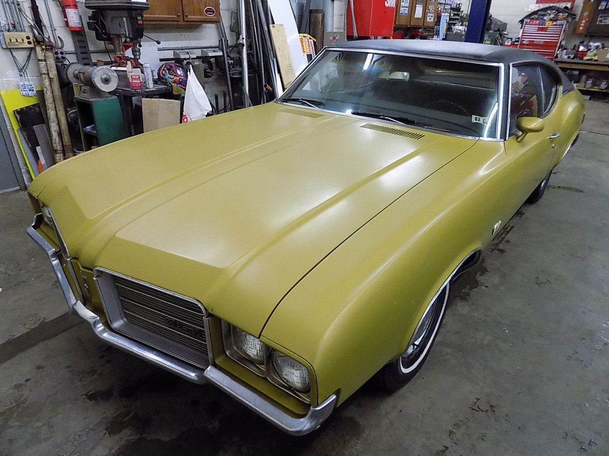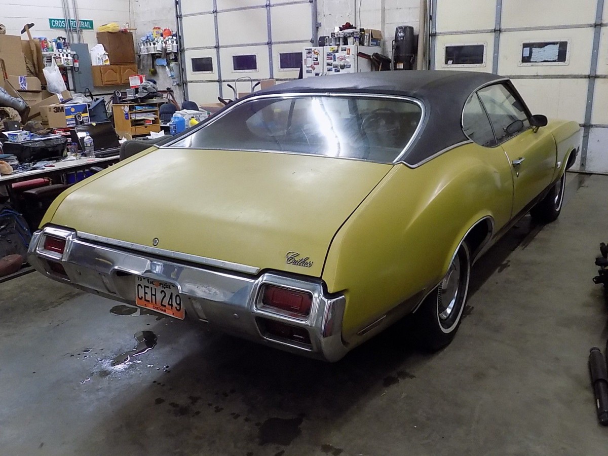 Had a 72 Cutlass… Same color combo, based on the before picture That funky gold with a green hint. Funny the clean pix look more green, but that could be fluorescent lighting playing tricks.. Lucky if I got 6 MPG with mine.
