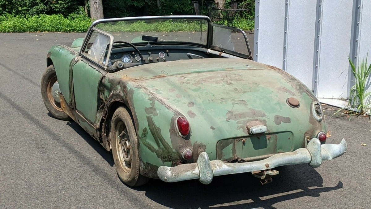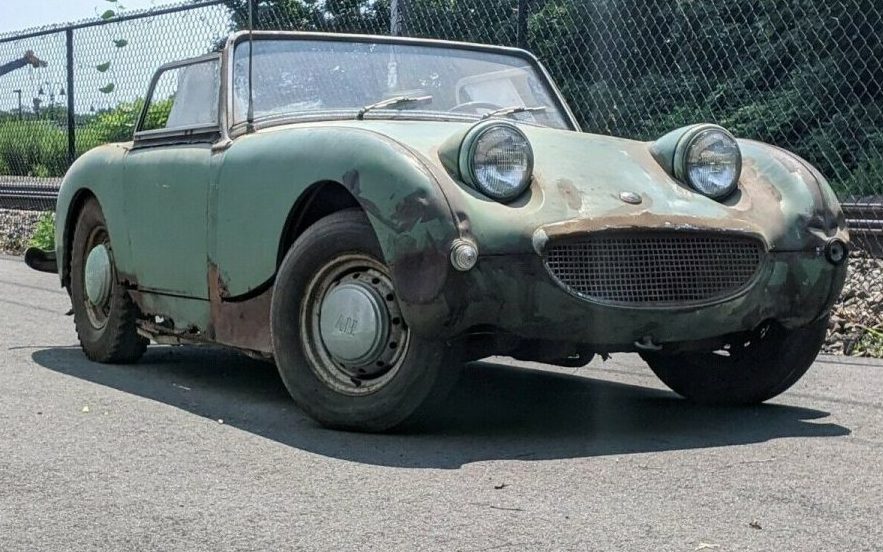 Our High School orchestra/music instructor drove his Bug Eye to work every day,…with no top, spring/summer/fall/winter. We were in Rockland County NY, not known for MILD winter. Seeing his powder blue Sprite zip into the school parking lot back in the 70s, EVEN IN THE rain!..was always a smile sender. His was “rough” but not this ROUGH…He had an excuse for the trashing his bug got with only a toneau cover in the frigid/rain weather..he was restoring a Jag, and my memory can’t recall if it was a xk140 or 150… But his little beat up Sprite , allowed me to get over my adolescent fear of British Autos… I hope this little car survives..even as a “runner”