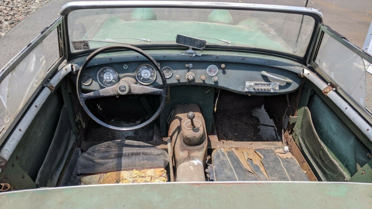 It is still largely complete, and that’s perhaps the best feature it has going for it. The glass and window frames are straight and seemingly rust-free, and the interior – while clearly tired – is all there. The original radio is still in the dash, and all gauges are present and accounted for. The door panels look savable, albeit with sagging map pockets. The steering wheel and gear shift knob are original as well, so the next owner will at least have good cores of interior components to work with should they decide to embark on a full restoration. Is that the end game with this Sprit, or is it too far gone to justify? The original title will accompany the sale, so perhaps an ambitious Sprite fan is willing to take this on due to the provenance being somewhat healthy.