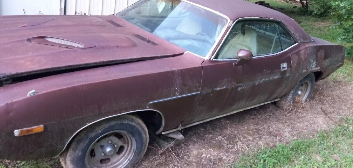 This is said to be a one-owner car with 78,000 miles. It was last registered in 1978 and last driven in 1985. Whether it’s been parked in the same spot since that time isn’t known, but time and rust have taken their toll. What’s left of the faded paint job looks to be purple/burgundy which we can’t quite match to an original color. It used to have a vinyl top which is long gone and may have been white to match the worn-out interior in this Plymouth. This was one sharp-looking hot rod back in 1973.