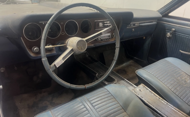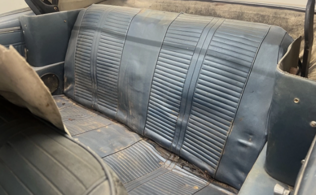 While the dark blue paint has outlived its usefulness, we’re told rust is not something you’re going to find on this machine. No doubt it has lived in a temperature-controlled space for many moons. Stuff looks to be missing, like the headlights, grille, and front bumper, but they can be sourced if necessary. The original interior looks better than you might expect after 60 years.