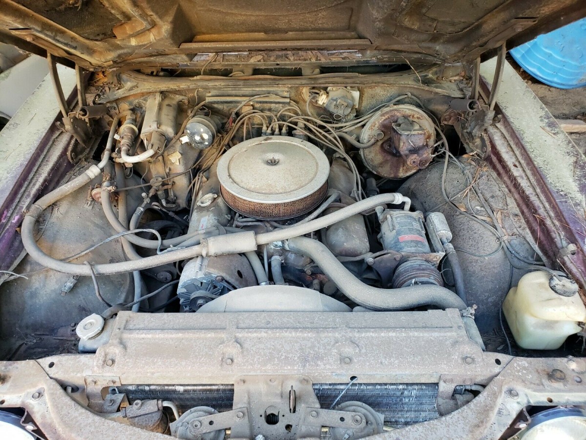 The body is about as good as you could hope after 38 years of shed life. The original color was code 78 Black Cherry, but the front clip and the rest of the car colors don’t match. Likely the car was in an accident and new sheet metal was required (perhaps that’s why it was taken off the road and then repairs got stalled). The grill is missing but the headlight extensions have survived. According to the seller, the car has solid quarter panels, doors and floors, but the front passenger fender has a bit of rust.