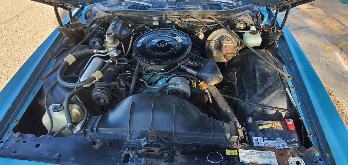 After major changes in 1973, the updates for 1974 were minimal. Perhaps the most noticeable was the use of 5-mph bumpers in the back matching the capacity of the ones installed in the front the year before. On some cars, they looked like cowcatchers, so it’s in the eye of the beholder if Pontiac was able to pull it off aesthetically. Colonnade styling came with opera windows on the 2-door models. The seller’s medium blue Pontiac once had a landau vinyl roof, although that’s been peeled away leaving behind its chrome trim and some surface rust.