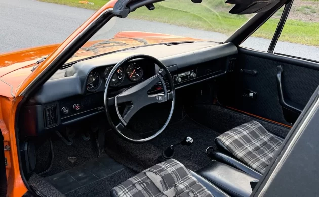 The interior also has that 1970s charm, with its neat plaid upholstery; the seller says that the driver’s seat shows “light wear,” but I’d say it might be a little worse than that. The passenger side, however, looks almost mint, and the upholstery material itself (Black and Gray Tartan) appears to be readily available at reasonable (for a Porsche) prices. The dashboard has a few minor cracks as well.