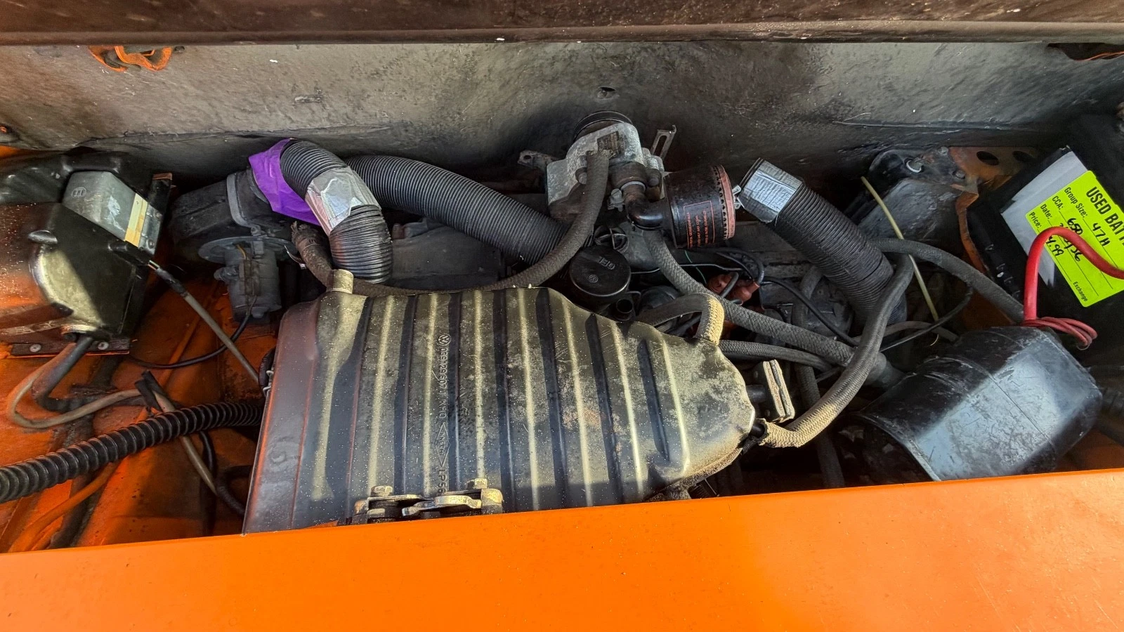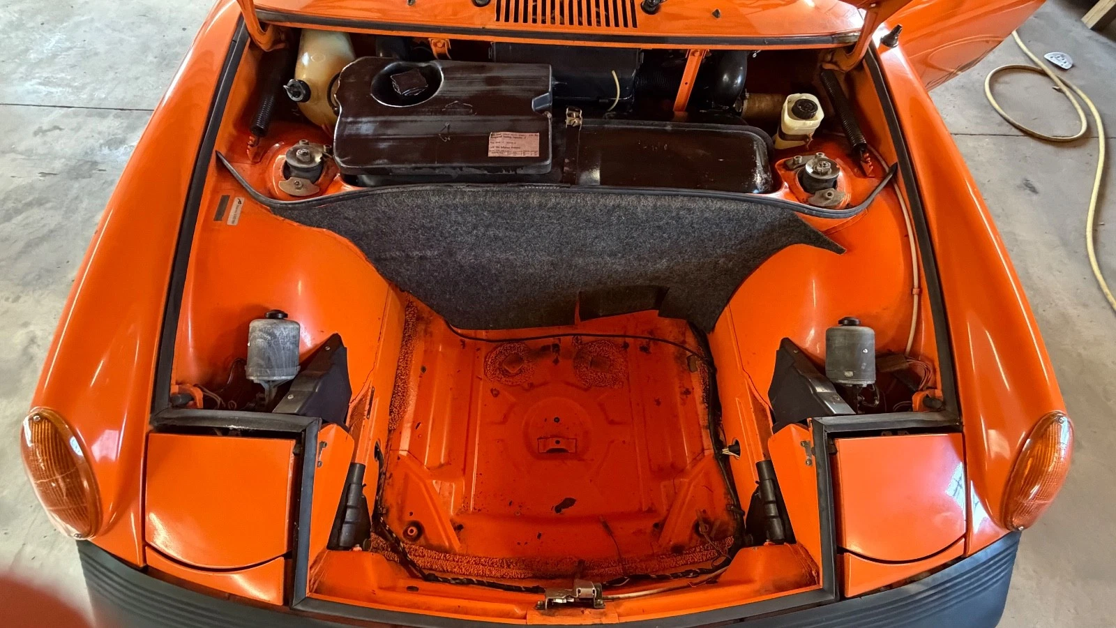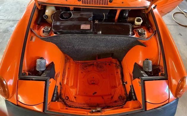 The front trunk is immaculate, and this is as good a time as any to mention the color, Nepal Orange, which replaced Signal Orange for the last two model years of 914 production. I think it’s the perfect color for a 914; in fact, any 1970s Porsche looks best (in my opinion) in a bright, neon color such as orange, yellow, or green.
