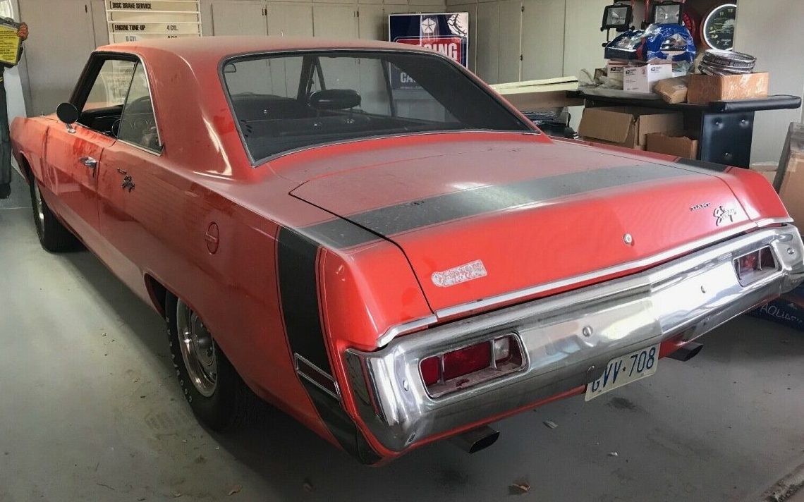 I don’t see lots of extra cost options in this car ; the Swinger 340 would have come with the white letter Goodyears and of course the 340 .I’ve seen a lot with the tail stripe too but don’t know if that was standard on the Swinger 340s. The auto trans would likely have been optional . The bench seat and AM radio ? well 99% of Swingers had those as well as the chrome drip moldings – no optional buckets or vinyl top with this car. The Hemi Orange was available as a standard color, one of about 25 colors for that year. Other than the hood pins ,I really don’t see it as anything more than a bone stock 340 car which to me is really cool , much like many of the first gen. roadrunners were – just a light car with a lot of power !