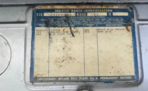 The glove box “service parts identification” tag is extremely light on options. I’ve seen tags that almost needed a second page, but that’s not a bad thing; it never hurts to simplify our lives. This truck has “heavy rear springs,” but it does not have the optional leaf springs in back.