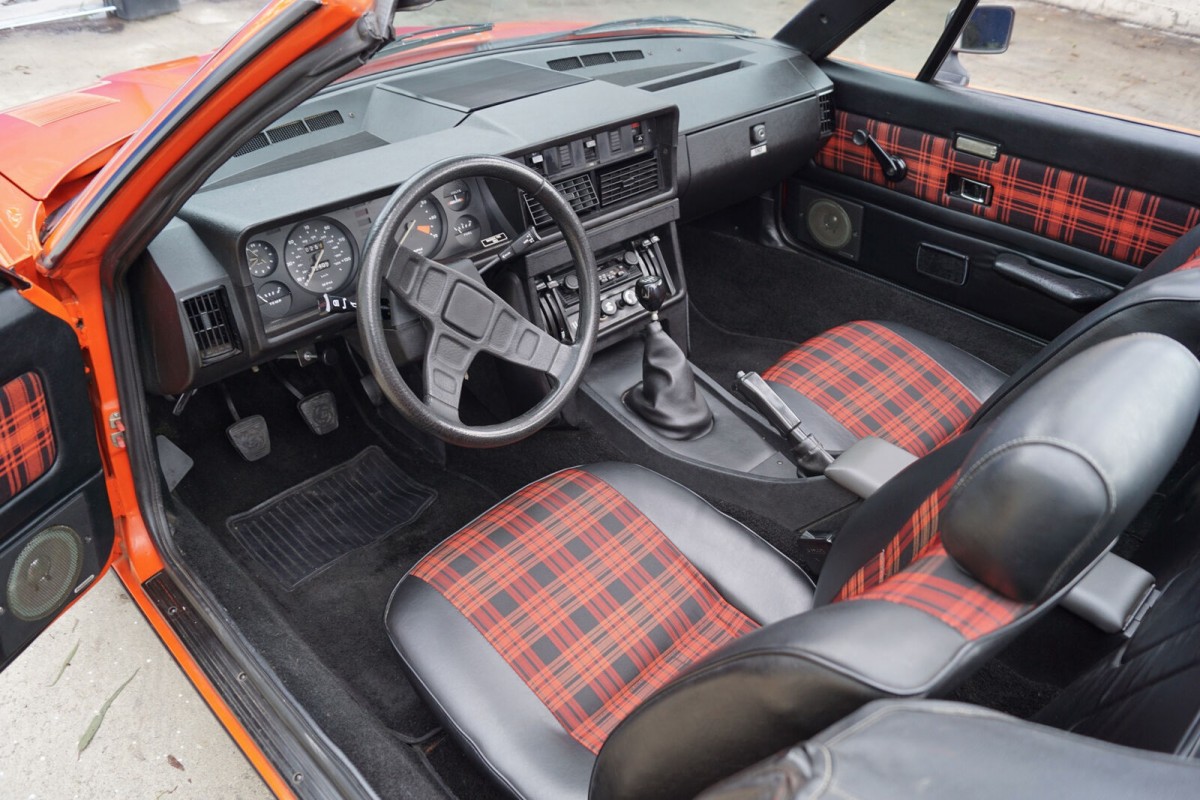 For reasons unknown, the original owner chose to only put 21,500 miles on this TR7 over 43 years. From all visual accounts, this machine presents as being flawless, as though it was just released from a time capsule. The body looks solid with no rust or damage and the Vermillion Red (orange-ish) paint is original, flanked by a black convertible top and a plaid interior in a color combination called “Carmine Red with Beige Tartan Check Cord”. The car is fitted with factory air conditioning, an uncommon option on a car of this nature.