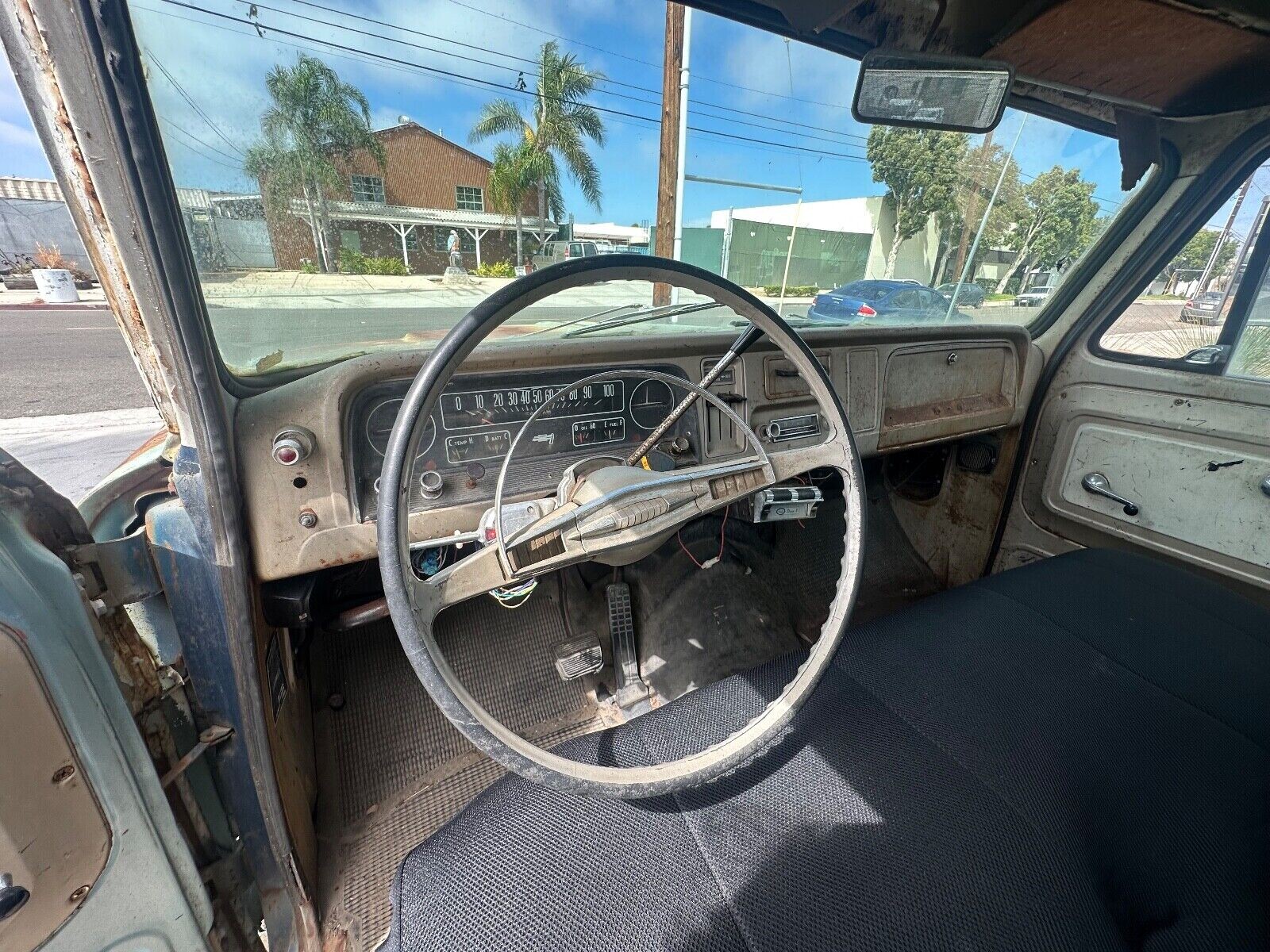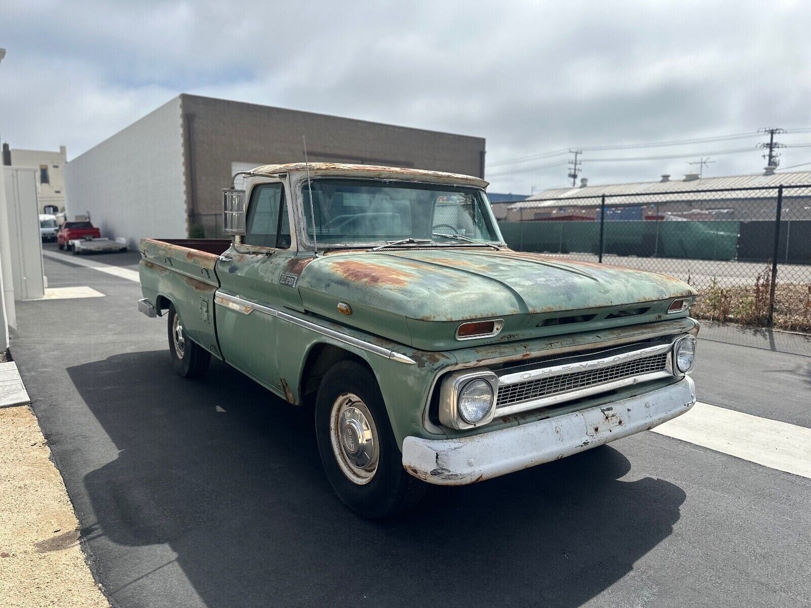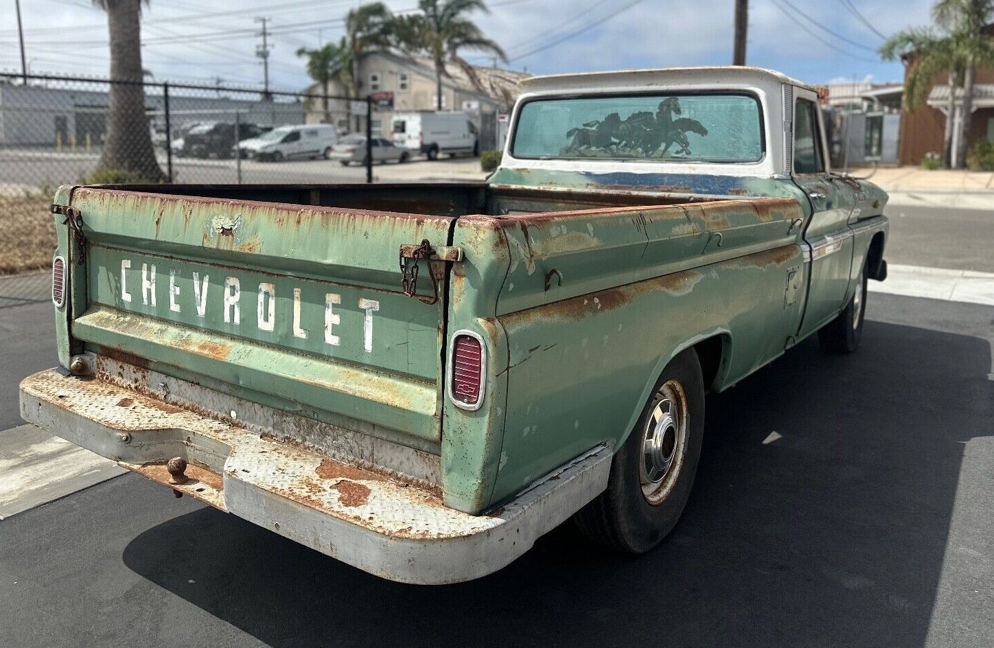 Talk about patina! This is as good as it gets for a rig like this, chock full of blemishes and faded paint but no cancerous rust. The bed sides are perfectly blistered with surface rust and if you’re going to have a truck with patina, a green base coat is perhaps one of the best compliments to the burnt orange appearance of old rust. The truck is a long bed which was the conventional choice for a working rig, and there’s no need for chrome bumpers here.