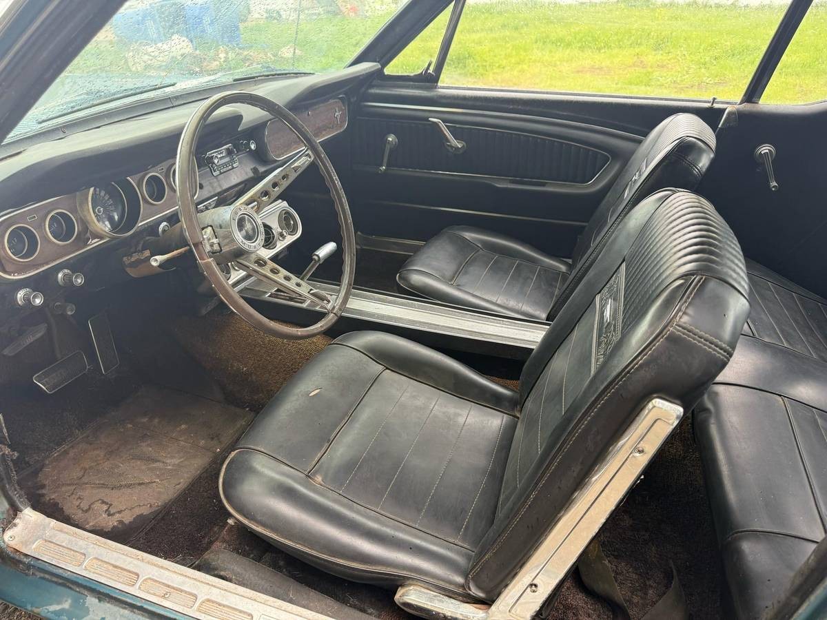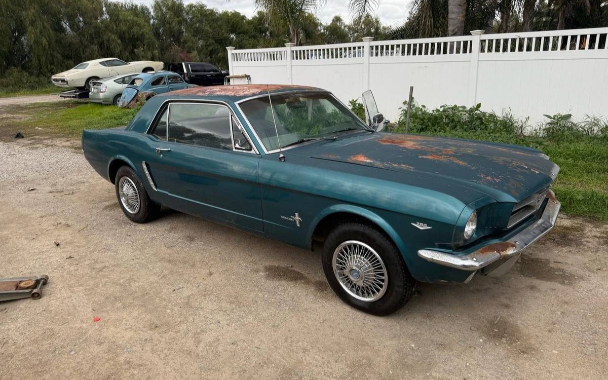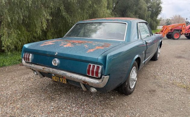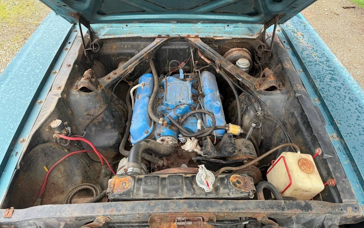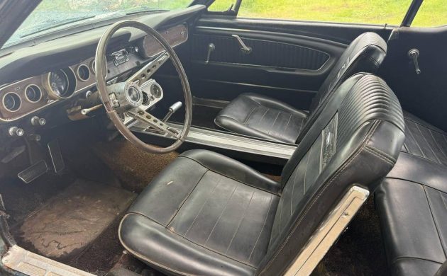 Options on this Mustang include an A-Code 289 cubic-inch V8. That means it has/had a 4-barrel carburetor, automatic transmission, wire wheel covers, “Pony” interior (maybe), and a console, thanks to a minimum. The worn paint (original) could be Twilight Turquoise, and rust may be on the verge of rearing its ugly head at the bottoms of the quarter panels. The indicated mileage is either 34,000 or 50,000, depending on the source.