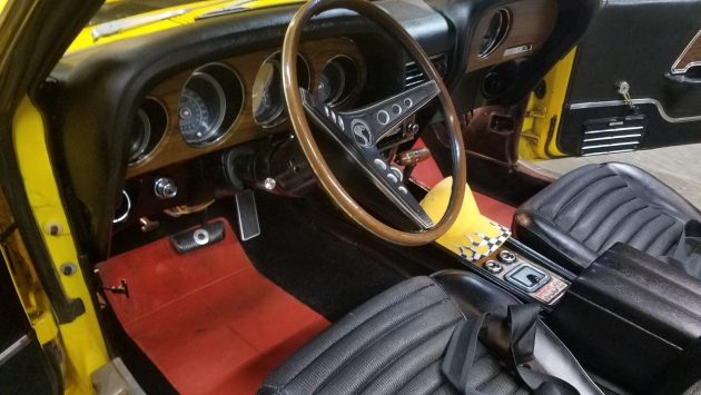 The seller says that despite the repaint, this Shelby should be considered a survivor. The repaint did occur many moons ago in 1977, so perhaps he’s right. Heavy documentation is included with the car, which is helpful considering I can’t remember ever seeing a Grabber Yellow Shelby that was part of the Hertz Corporation’s fleet. Wood trim looks quite nice, both on the steering wheel and inside the dash.