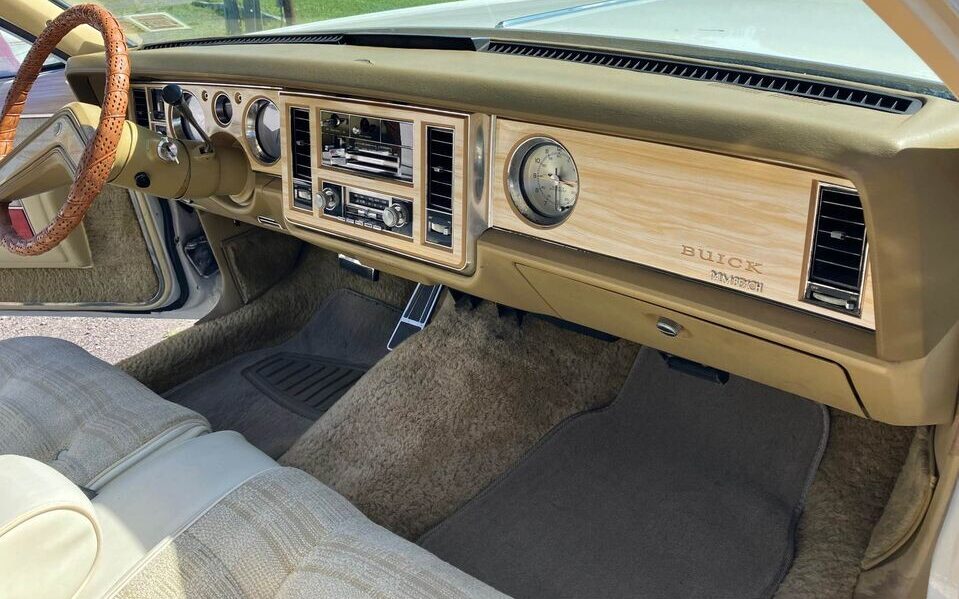 So, the idea here is all about looks, as in pastel shades, sprayed over a full-size passenger car that would make a splash with the retirement set. The two-tone finish is a combination of Code 11 – Antique White (top, hood, trunk, and rocker panels) and Yellow Beige adorning the sides. Other features include Yellow Beige bumper strips, gold body side stripes, Yellow Beige tinted grille, Yellow Beige custom wheel covers and side belt molding, white sport mirrors, and “Palm Beach” badges. Our 94K mile subject is still puttin’ on the Ritz and shows like new. One variation is the wheels, this country club cruiser is wearing optional Buick road wheels – a good choice.