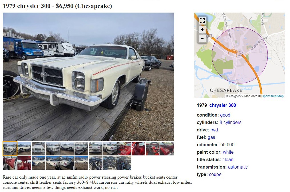 Leaving the factory, most 1979 Chrysler 300s were Spinnaker White, but around 30 or so were said to have been painted Rallye Red. I don’t know if I’ve seen a red one, but, pool or pond, either color works for me. This rust-free example is posted here on craigslist in Chesapeake, Virginia and the seller is asking $6,950, Here is the original listing, and thanks to Mitchell G. for the tip!