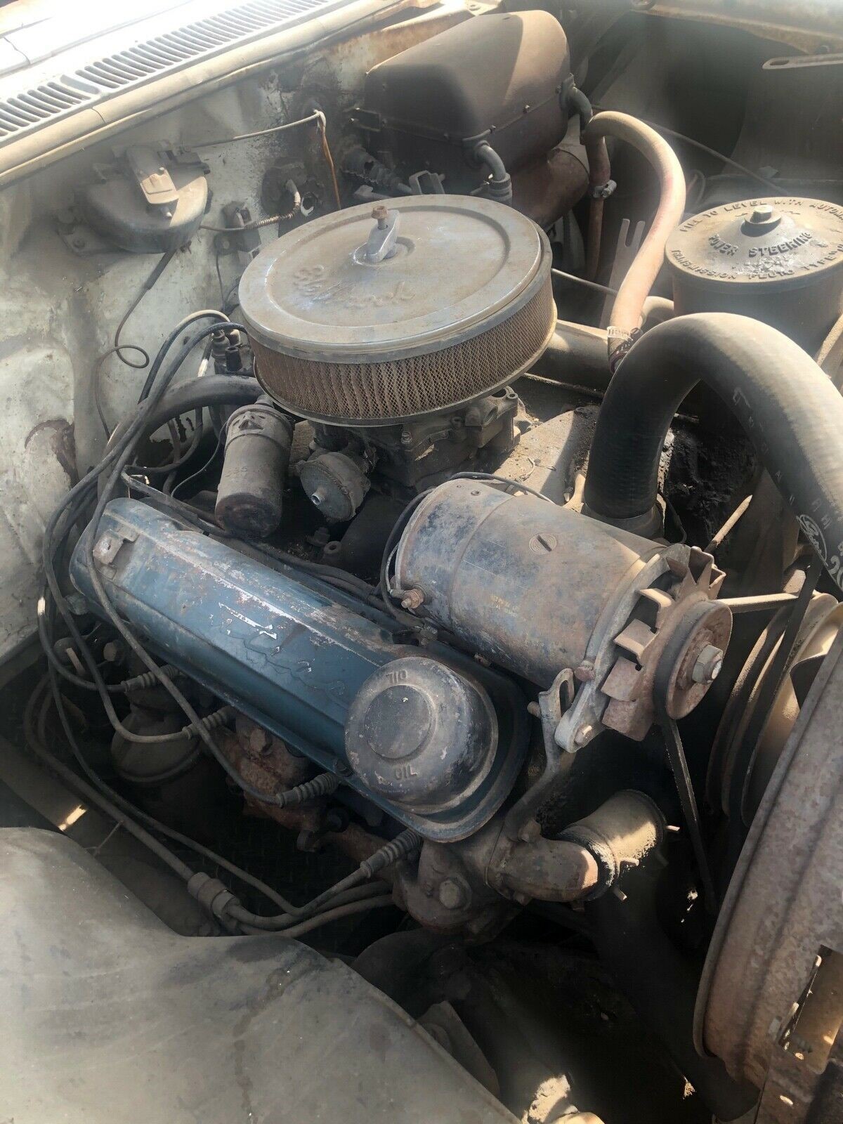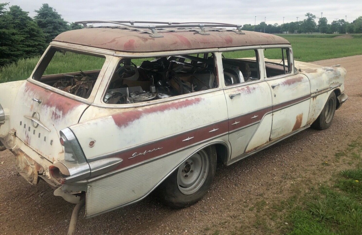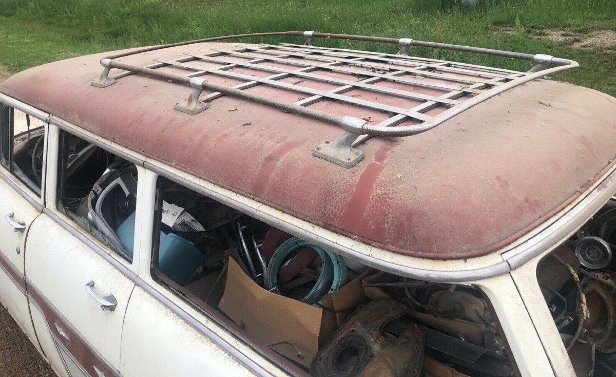 The body looks good with some evidence of surface rust. We’re told there is no Bondo anywhere and no bodywork has ever been done. Unfortunately, all the glass looks to have been broken out by kids or vandals, but the same glass that goes in the ’57 Chevy wagon will fit in this car. The only metal that may need replacing is the floor pan on the driver’s side (these cars had under-seat heaters which were prone to leak). The tailgate has a few little holes that will need to be filled and the lip on the hood needs some attention, too. The interior is said to be complete and the material old and brittle, covered up by loads of parts that we assume will go with the deal. Given the usual attrition rate for wagons this old, there can’t be too many of them still around.