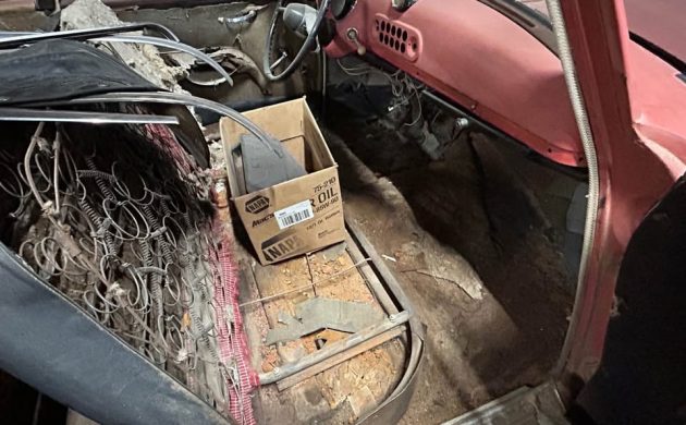 Well, if the thing runs, you’ll get lots of airflow driving it, because besides the missing top, you’ll get full-flow ventilation from all the rust holes in the body. This car is long gone beyond a worthwhile restoration but would make a nice parts mule.