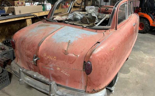 Meanwhile, the company was still soldiering on with a 172 cu. in. flathead six-cylinder, good for 82 hp. The offset to sluggish performance was great gas mileage, but that was not enough to save the company either, as the postwar recovery kindled buyers’ desires for larger, more powerful cars. Our seller notes that this engine is in unknown condition, though the three-speed manual does move through all its gears. The odometer is quoted at around 77,000 miles.