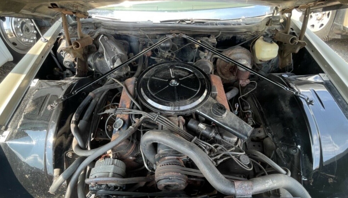 This car was purchased new in Tacoma, Washington, and the original owners held on to it forever, although it spent the last several years squirreled away in a barn. The seller found the car and had it shipped to them in Vegas where he/she went about the task of getting it roadworthy again. All it took was a new set of fluids and battery to fire up the sleeping beast and we’re told it runs well now. No smoking, leaks, knocking, anything from the 500 cubic-inch V8 motor and the automatic transmission shifts the way it should. The seller has been kind enough to come up with a video of the car in action.