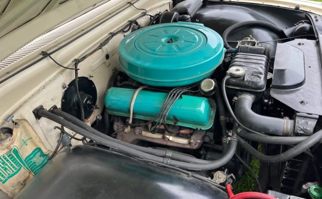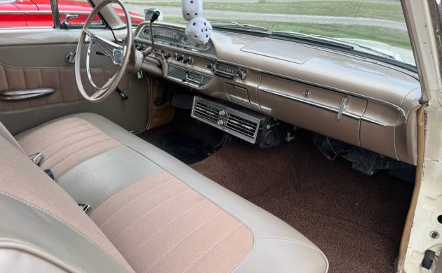 Being a Ford in almost everything but name, the engine compartment will look familiar to anyone who’s seen a 1960 Galaxie. This Ranger had “high-stepping performance” with three engine choices, the top dog being this 300-horsepower “Super Express” 352, which was a $230.80 option. Doing the shifting was the optional “Dual-Power Drive” three-speed automatic, which was the same Cruise-O-Matic you’d find in a Galaxie or a Thunderbird. The seller says that this Ranger has been restored, although I’d say it was done some time ago. Notice the air conditioning compressor; it appears that someone at some point added an aftermarket unit, which will be nice if you’re enjoying your Edsel in those Missouri summers. Also notice the neat “Edsel” windshield washer bag located on the passenger-side firewall, a rare piece for certain.