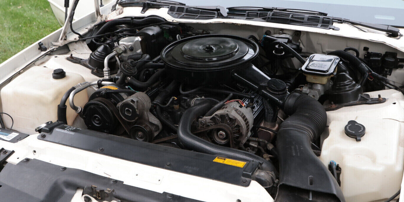 The interior looks pretty good though the seller mentions, and the image documents, wear damage to the driver’s side seat back, specifically the outer bolster. The degradation is supposedly due to slipping in and out of the seat but it seems exceptionally worn for a car with only 32K miles. Other than that foible, the rest of the environment is bright and clean. The overly plasticky dash is sharp-angled and oh-so typical for the era. The seller mentions that the A/C system is complete but is no longer functioning with loss of refrigerant, while in storage, singled out as the primary culprit.