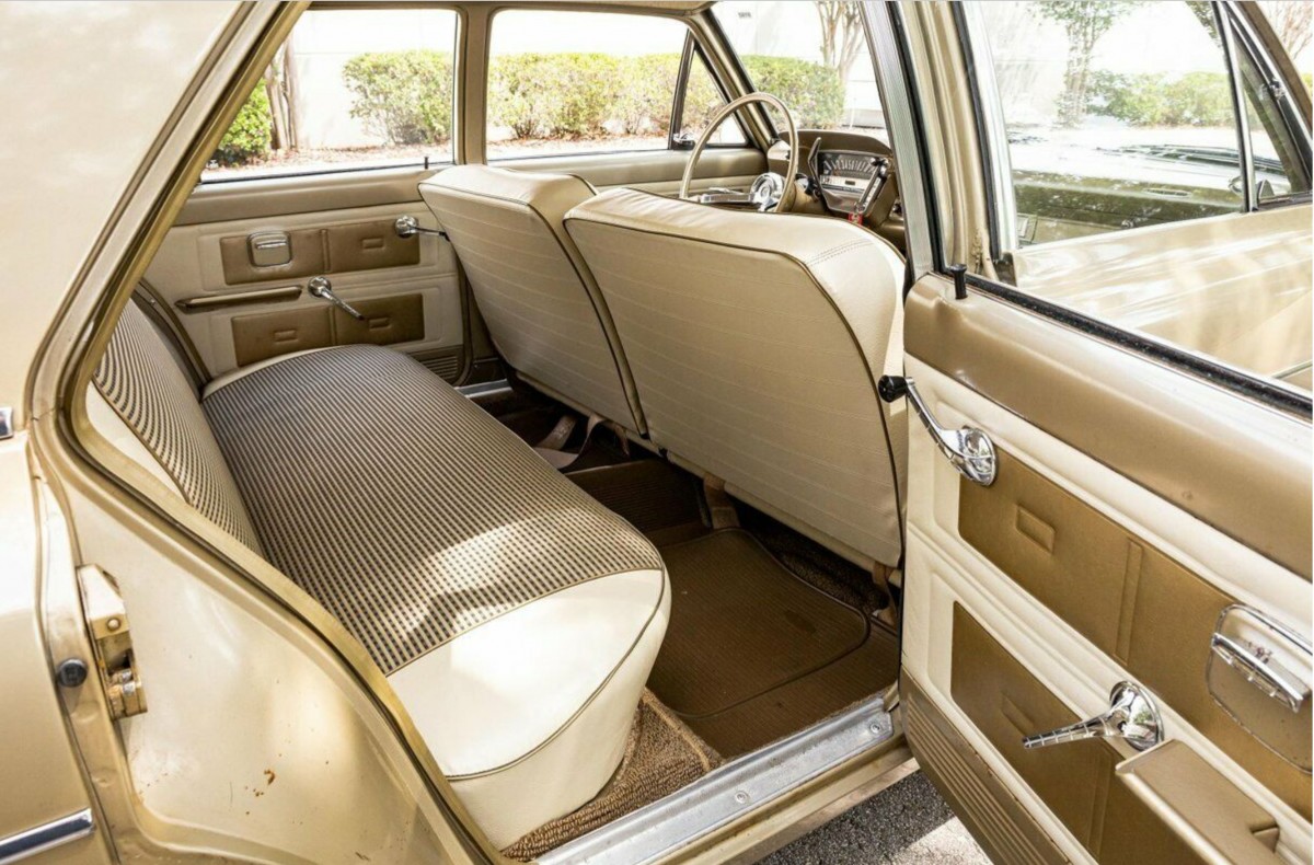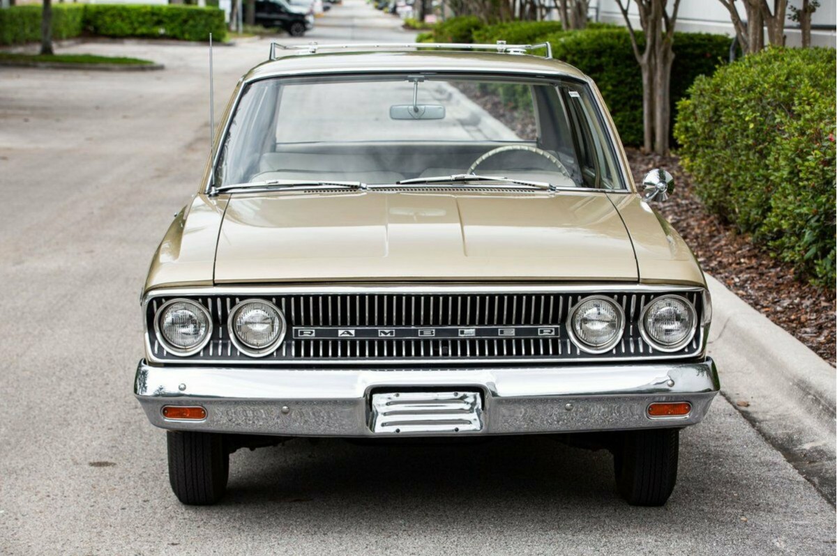 My 1st car in 1967 as a senior in high school was a gold 1963 Rambler 4 door sedan, 3 on the tree and the same 196 cast iron 6 cylinder engine. I don’t believe that cloth upholstery ever lasted without splitting for even 70,000 miles. Also, the front grill is a thin aluminum extrusion and dents very easily. This car appears to have only 1 major indentation in on the right side of the grill. Rare to see one where the top edge of the grill looks perfect straight across.