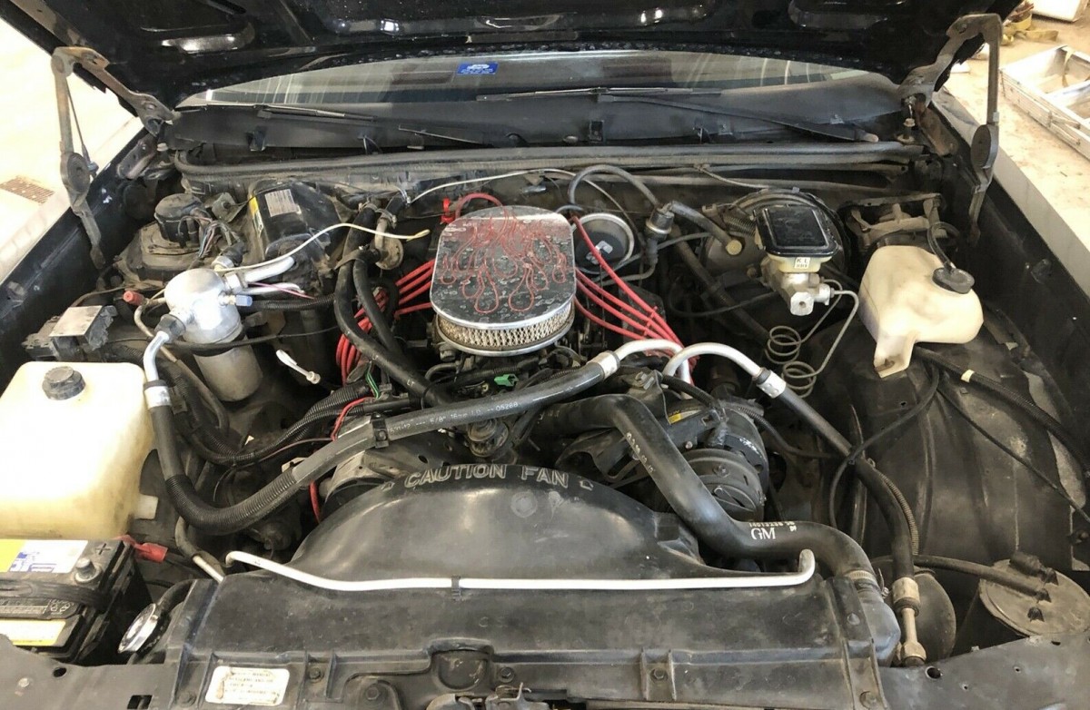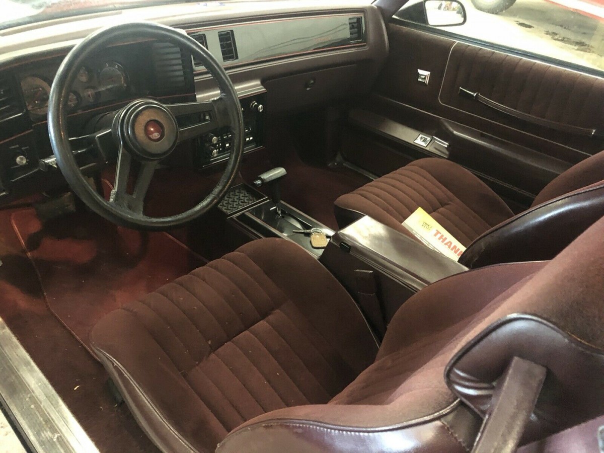 Inside the car, it has that ‘80s look to it with the velour-like coverings on the seats. The burgundy balances well with the black exterior and burgundy accents. The factory rims are wearing brand-new raised-letter tires and the seller says the machine runs great. I would have polished the chrome aftermarket air cleaner before taking the photos and we assume that’s the only modification to the powerplant.