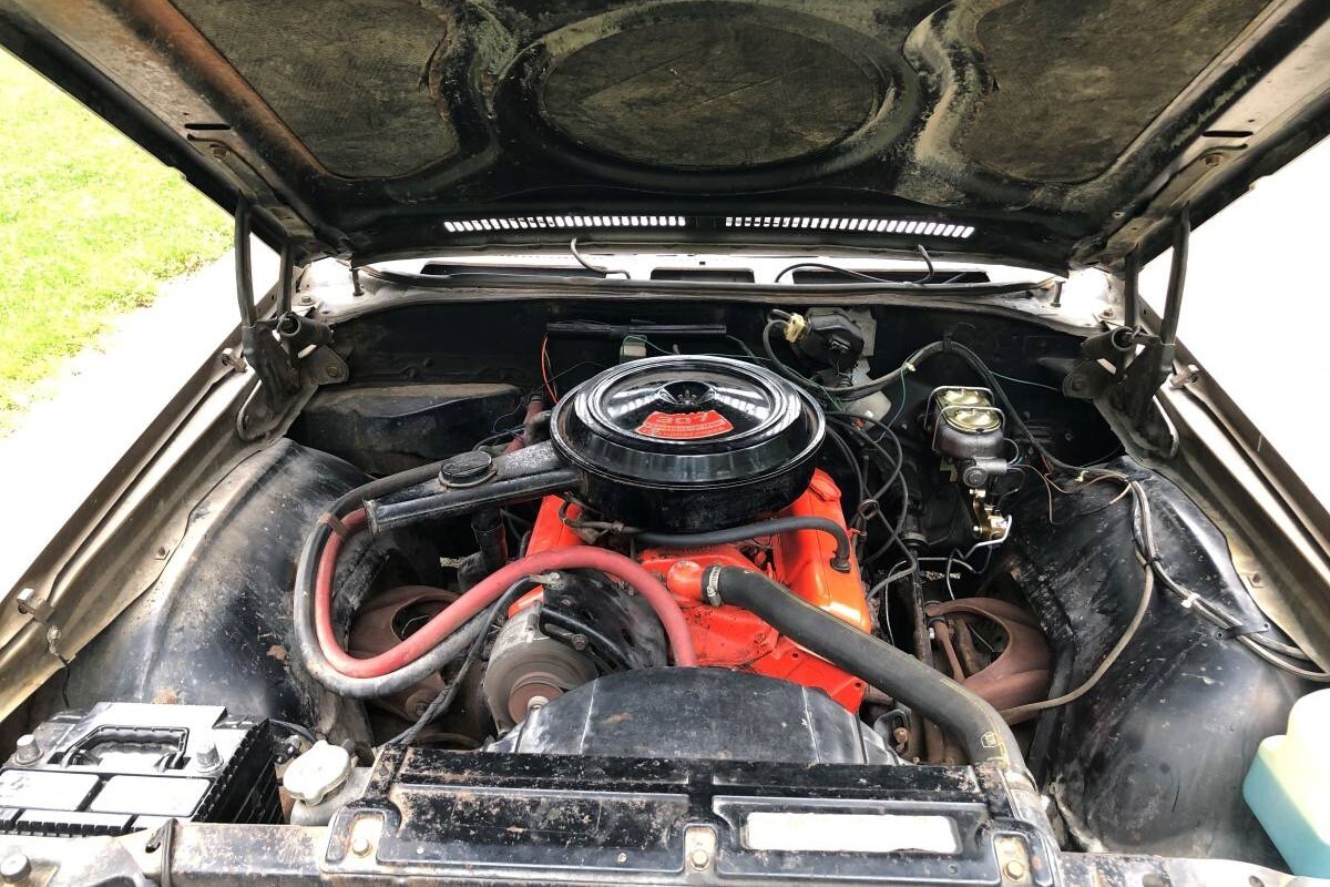 When the seller’s car was built, the options checklist was kept fairly low. The original owner opted for the 307 cubic inch V8 over the inline-6 and a TH-350 automatic instead of the 3-speed manual transmission. Power steering, but no power brakes. No factory air conditioning, but two-tone paint, Classic White over Autumn Gold (I had a ’70 Nova that wore those colors). In 53 years, a little more than 1,000 miles were added to the odometer with each turn of the calendar.