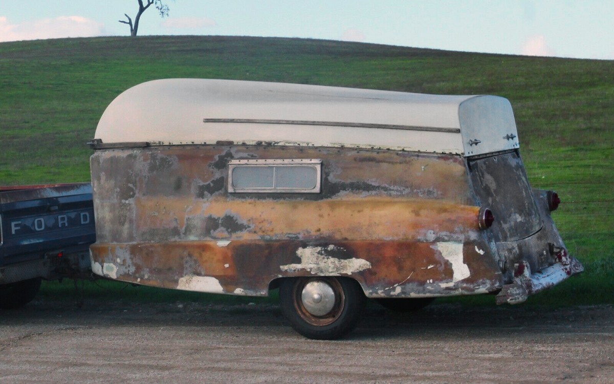 The lure of the open road has been a part of the human psyche since Grog and Zronk put a couple of stone wheels together, grabbed their clubs, and headed across the prehistoric landscape in search of a Starbucks. Before too long, they found one. Actually, it turns out that there was also another one on the adjacent corner, some things never change. This beautiful, historic gem is a 1954 Kom-Pak Sportsman trailer and it’s listed here on eBay in beautiful, equally-historic San Luis Obispo, California. The seller is asking $6,300 or you can make an offer.