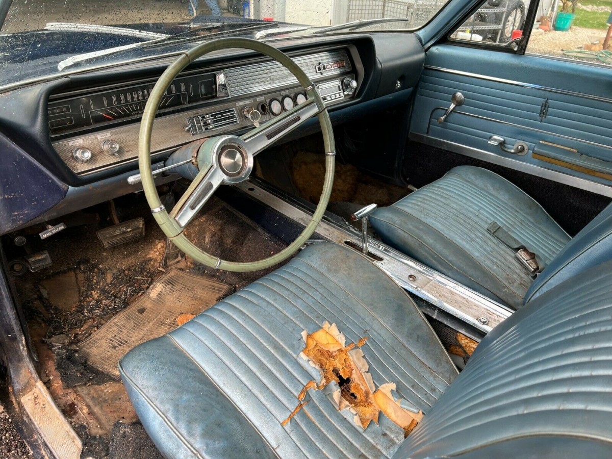 Rust may be the biggest challenge with the car as both rear quarters have been cut short to reduce some of it. We’re told there is corrosion on the frame and the floorboards and trunk are not sources for optimism. A lighter shade of blue can be found in the trunk area that would point to an earlier change in paint color. The interior is going to need work and if you want the dash to be original, you’ll have to correct for some aftermarket gauges that were added. Both the door and trunk latches are MIA, but the seller has new ones to replace what once was there.