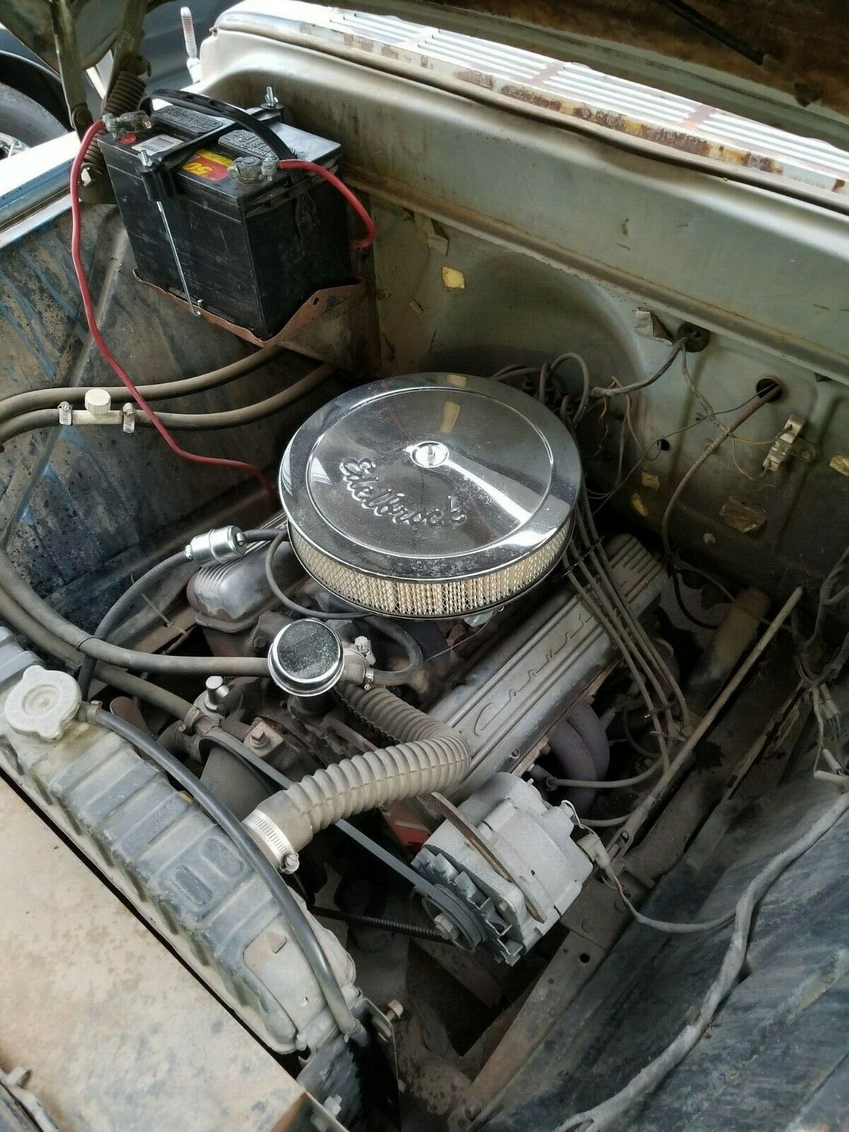 The 4-speed manual transmission surely didn’t come from the Corvette that donated the 327… that looks like a top loader truck transmission to me, so no power shifting this thing unless you swap the trans for something else. Neat truck though.
