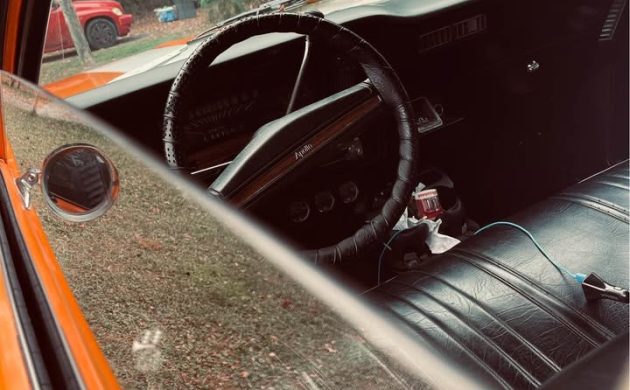 Buick sold a lot of sedate-looking automobiles in its day, so a bright orange paint job seems a bit flashy. Perhaps it was a factory color that you could get with white stripes – or maybe they were added later. The interior is black vinyl and – like most Novas – could be fairly sedate. If you have a not-so-good truck, the seller might trade for it if you add some cash.
