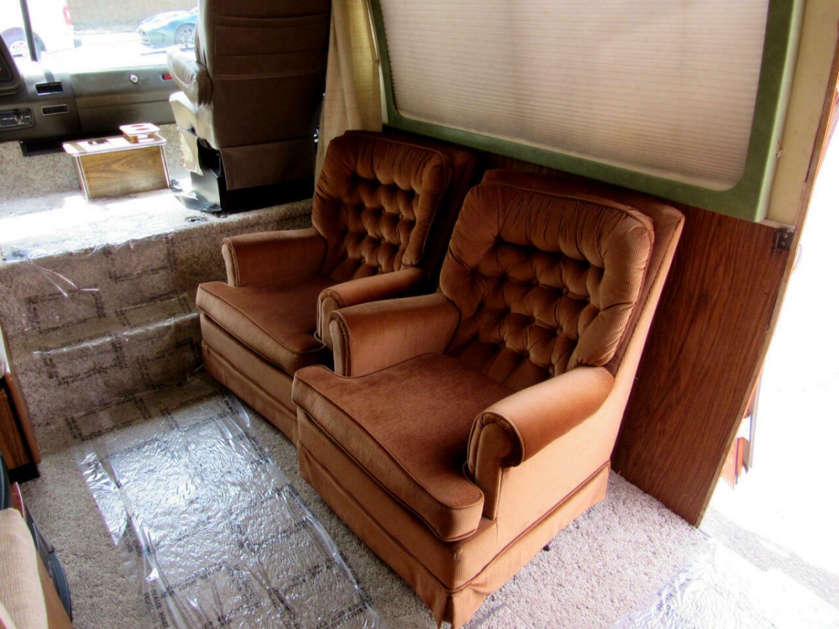 This does appear to be a very decent motorhome, but definitely not the unmolested low mileage motorhome the seller would like us to think it is. The two front seats have definitely been changed out because GMC never offered that type of seat when new. The two chairs crowded into the living room probably replace a settee that would have converted to bunks. A queen size mattress stuffed in the back is likely covering upholstered seating area that would have originally converted to a bed but has been discarded. For some it is more usable but for $28,000, I think I would be looking or a more unmolested original unit.