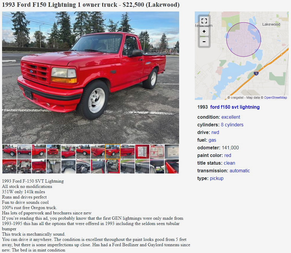 Ford’s Special Vehicle Team (SVT) introduced a few fun and interesting vehicles, not the least of which was a single-cab short-bed pickup. I see maybe two single-cab short-bed pickups a month and can’t remember the last time I saw a 1993 Ford F-150 SVT Lightning on the street, or even at a car show. The seller has this example posted here on craigslist in Lakewood, Washington, and they’re asking $22,500. Here is the original listing, and thanks to Curvette for the tip!
