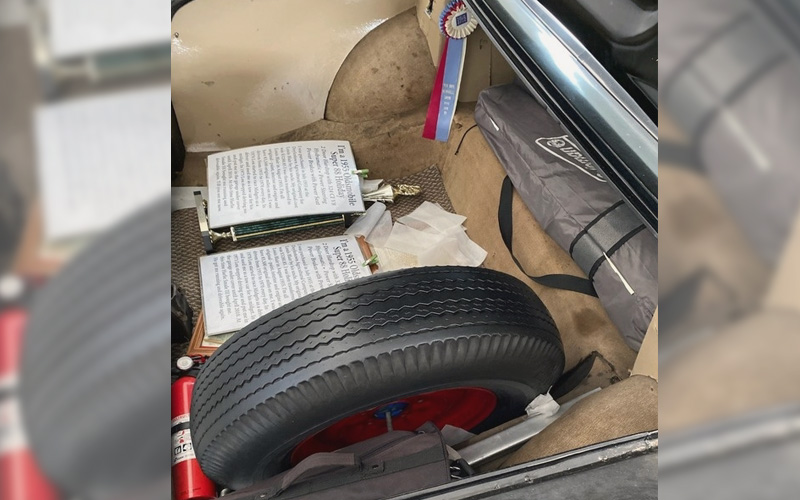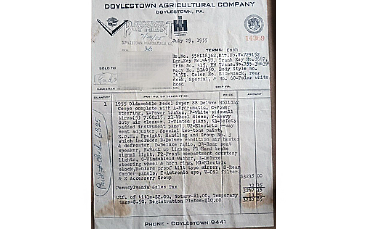The seats look perfect, both front and rear, as you can see, and it sure looks like the next owner will be getting a nice car. The fabric pattern appears to be exactly like what you’d see in a 1955 Olds brochure, and I do see one small separation in the red vinyl (?) material in one of the seller’s interior photos. Otherwise, what a gorgeous time capsule. The trunk also looks outstanding. We don’t get to see any underside photos, but the seller has included a piece of gold: the original sales slip showing all of the features and options, along with colors and other great info!