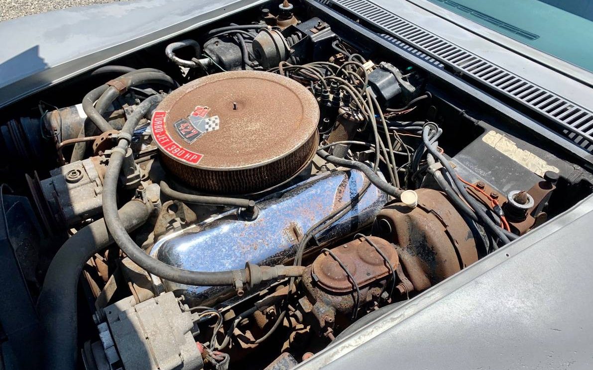 The L36 427 cid (7.0L) V8 retains its factory carburetor, California emissions equipment, and other original details. Thanks to gmheritagecenter.com for some details. Would you fix only the necessary mechanical and safety items on this first-year C3 or go for the complete restoration?