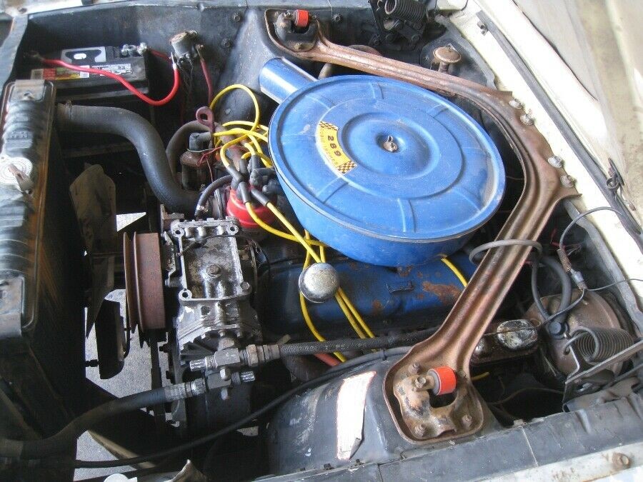 If potential buyers consider this Mustang purely as a survivor, the Deluxe interior appears to be pretty serviceable. I can spot a seam split on the driver’s seat, but that seems to be one of the few upholstery flaws. The passenger seat and door trim are impressive, while the back seat looks like it has never been used. The carpet has some wear and fading, which might prompt a meticulous owner to fork out $200 for a new carpet set. The driver’s seat leaves me in a quandary. It would be worth the effort to consult an upholsterer to see if repairing the split would be viable. However, the covers may still need to come off because there’s evidence that the foam is beginning to collapse. The dash is in good order, and the original AM radio remains intact. It seems that the original owner liked a few luxury touches because he ordered this GTA with factory air conditioning and a roof console.