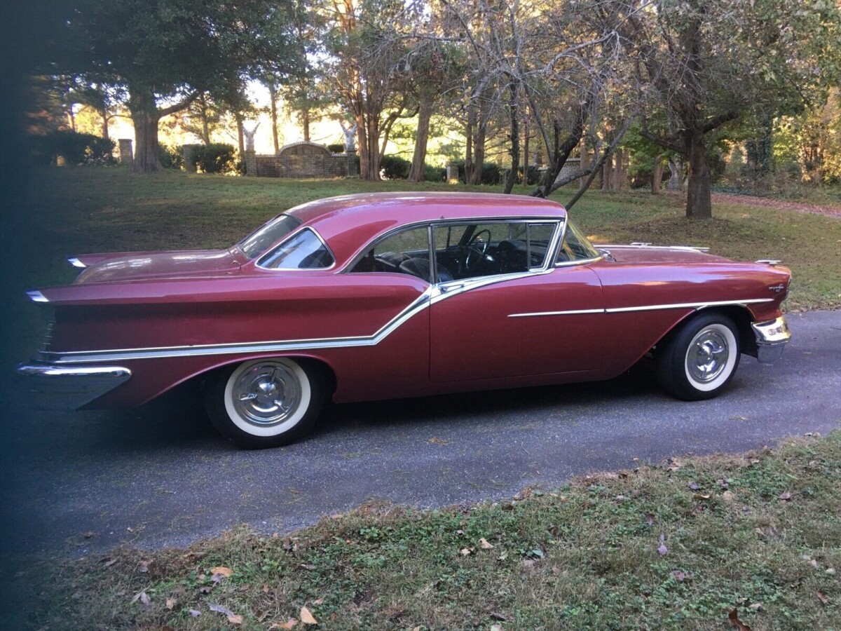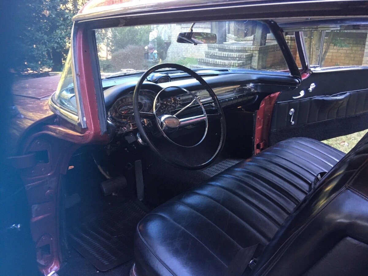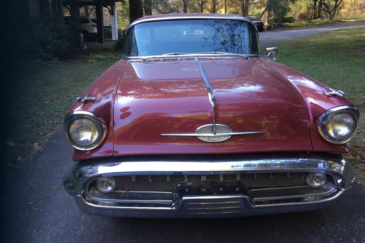 The interior is not original. The 1957 Super 88 featured two- or three-tone upholstery and highly detailed door trim.