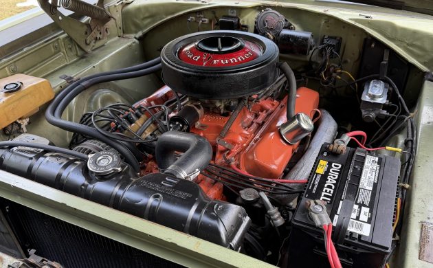This Road Runner’s interior is consistent with a driver-grade classic that can provide immediate motoring pleasure. Trimmed in two-tone Green, the cloth and vinyl upholstered surfaces are free from distress. The carpet is slightly worn under the driver’s feet, but still presents extremely well for a classic of this vintage. The same is true of the dash and pad, and the only genuine flaw potential buyers may consider addressing is the cracked wheel. Someone has added a column-mounted tachometer and a radio/cassette player, but removing both would be child’s play if the new owner prefers originality.