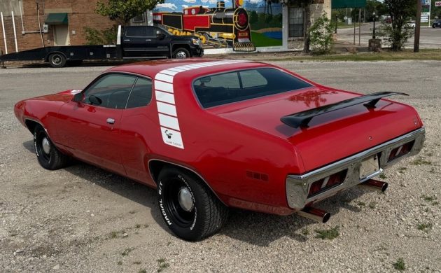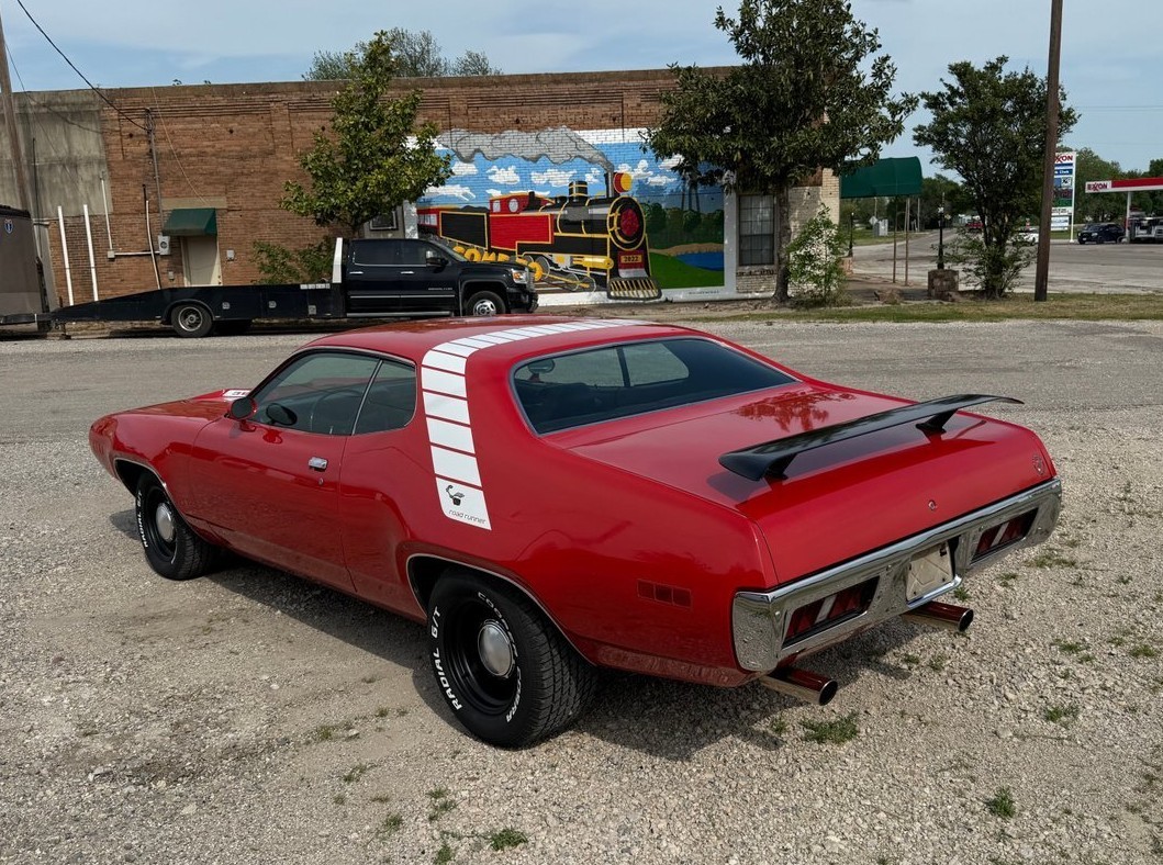 Where are the very cool factory exhaust tips? Why the ever addable rear wing. The stock black wheels and dog dish hub caps look horrible. Other than that, the 71 Roadrunner 383 has 335hp. It dropped in 72. The car it’s self is in really good condition.