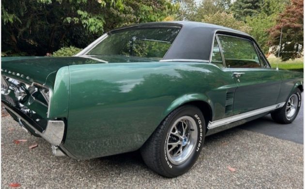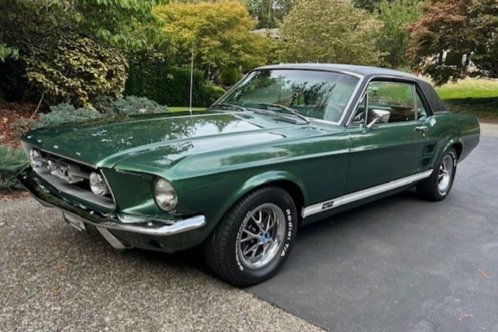 Ford introduced the first significant upgrade to its Mustang for the 1967 model year. The car’s physical dimensions grew slightly, but the changes weren’t specifically designed to counter emerging competition from the Chevrolet Camaro, Pontiac Firebird, or the Plymouth Barracuda. Its roots rested more in its quest for performance gains, and after enormous sales success in 1966, the company was unwilling to mess too much with a winning formula. This ’67 Mustang is the GT variant, ordered by its first owner in Dark Moss Green with a Black vinyl top. The seller doesn’t mention a restoration history, and their emphasis on originality suggests that this GT is a survivor. However, one interesting feature of the seller’s listing is that the car wears a chrome luggage rack on its deck lid in one shot, but not in others. That option isn’t mentioned in either the listing text or the included Marti Report. That image also reveals a significant paint defect in the driver’s-side rear corner that has magically disappeared, suggesting this classic may have received at least a touch-up at some point. Its presentation is still mighty impressive, because the paint shines beautifully, the vinyl appears flawless, and there are no visible panel defects. The Mustang has spent most of its life in sunny California, making its rust-free status unsurprising. The trim and tinted glass are excellent, and the Mustang rolls on an original set of Ford’s attractive styled steel wheels.