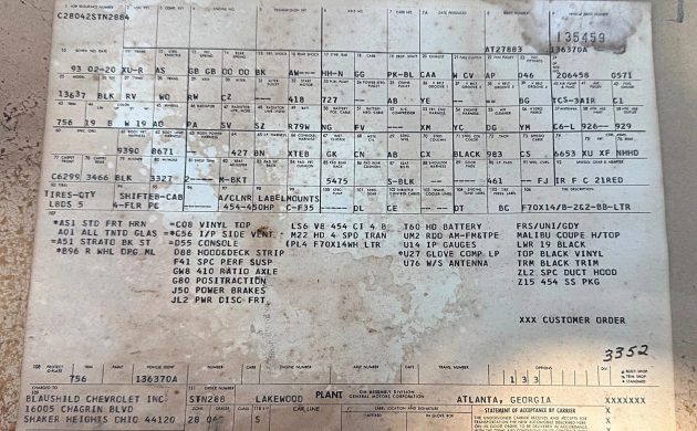 The Chevelle is lovingly described as the original buyer’s pride and joy, but sadly, he is now deceased, and the title was passed down to his son. Dad ordered this one with racing in mind, as evidenced by the build sheet, which shows excellent specs such as a 4-speed manual transmission, a positraction rear end with 4.10 gears, plus the icing on the cake, a 454 engine of the LS6 variety. Sending at least 450 HP quickly and consistently to such a low-end ratio differential eventually took its toll on the big block, and after the factory powerplant blew up, a 396 was installed in the bay as the replacement. That motor is also now in need of a rebuild, but the seller has a line on a correct date-code 454 block, so unless you happen to have one dormant in your garage, that’s probably worth following up on. Fortunately, the transmission and 12-bolt unit are both still the original components.