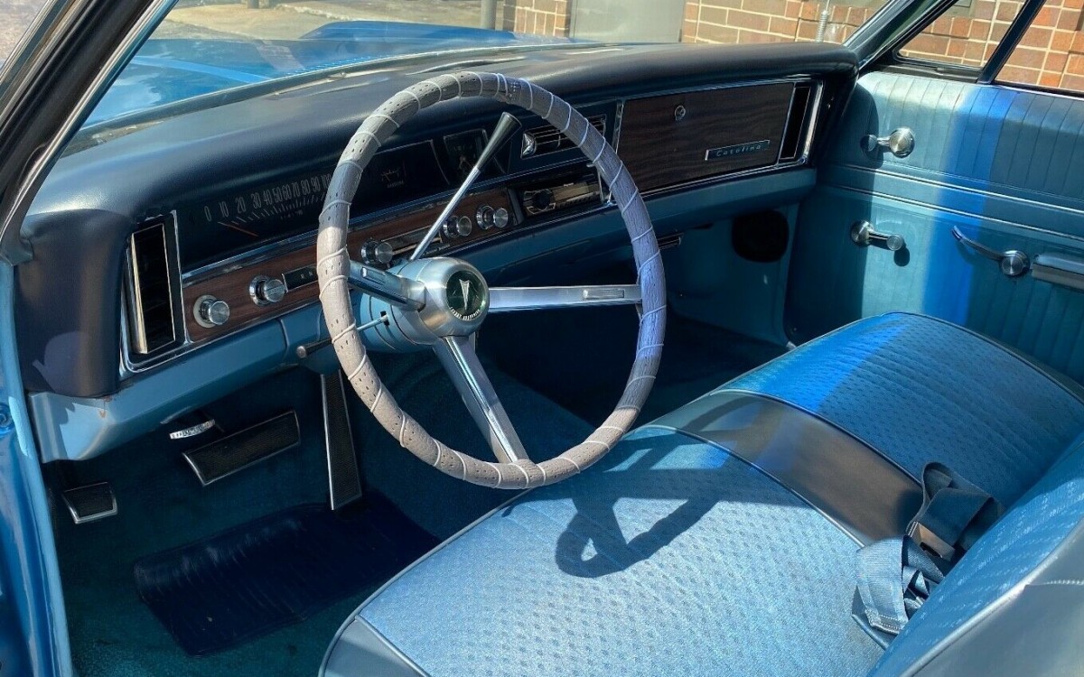 This 1967 Pontiac Catalina is finished in blue, which the seller says is an older paint job but of very nice quality. The body is said to be straight and all of the panels are claimed to be original, with a nice fit and finish. It’s also got wheel skirts on the rear quarters, which sort of gives the car a cool low-rider effect, at least in that area. The chrome is all original and in good condition, with the trim and glass said to be in excellent shape. New Firestone Firehawk white letter tires can be found all the way around, with Pontiac Motor Division spinner hubcaps.