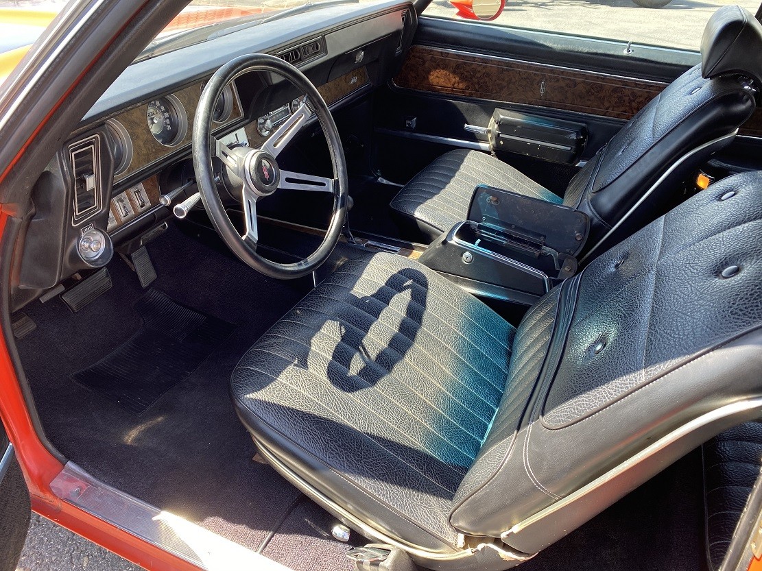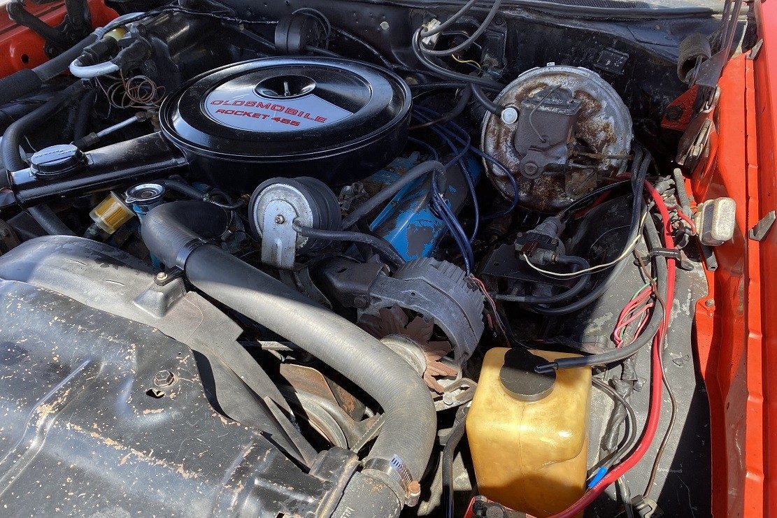 The 442 is finished in Rally Red, and it features a Black power top. The top operates exactly as it should and appears to be tight and free from problems. The paint shows plenty of chips and marks, but it still remains presentable for a driver-quality classic. The seller states that there are no signs of any previous repainting or repair work, and he believes that all of that Rally Red is original. Rust hasn’t managed to get its claws into the Olds in any meaningful way. A hole in the trunk pan will need attention, and since it is no larger than a dollar bill, it will be easy to address. The remaining floors and the frame appear structurally sound, with no issues to report beyond the occasional spot of surface corrosion. All of the trim is in good order, as are the glass and the wheels.