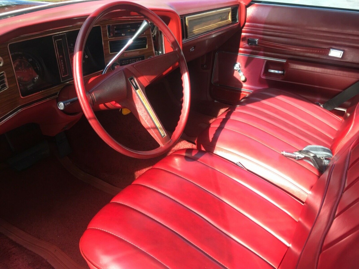 For a ’75, this thing is really interesting. The bumpers don’t hurt it that badly, the rims and wheels work perfectly with the black body, and the half vinyl roof and red interior are really cool.
