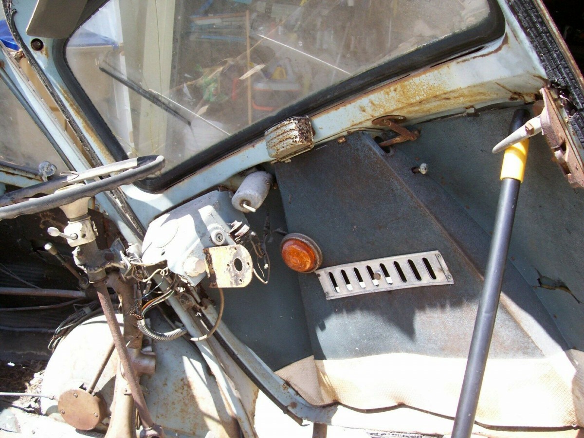 The interior of the Isetta is remarkable in its apparent simplicity, with a bench seat that can accept three people. However, that apparent simplicity does disguise some pretty innovative thinking. The single door opens very wide, making access to the car a breeze. To further improve the access, the entire steering column and control panel is attached to the door and pivots outwards with the door itself. There is little in the way of creature comforts, with a vent opening in the center of the door being about it. The interior of this Isetta will require a fair amount of restoration work (relatively speaking), but at least it does appear to be complete.
