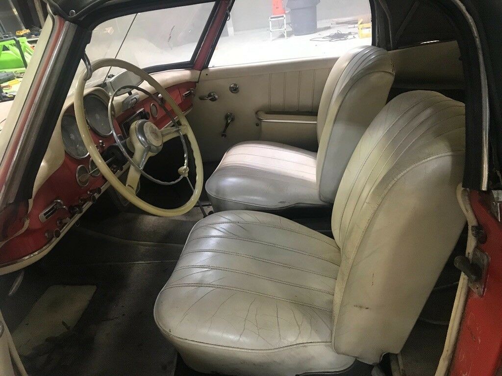 Inside, the car is in very good condition for its age. The seats are listed as leather. While they are faded now, they could be cleaned up easily and the white, luxurious seats will compliment a washed and cleaned red paint on the outside. The listing makes note that there are a lot of extra parts that come with the car and one photo shows parts in the trunk.