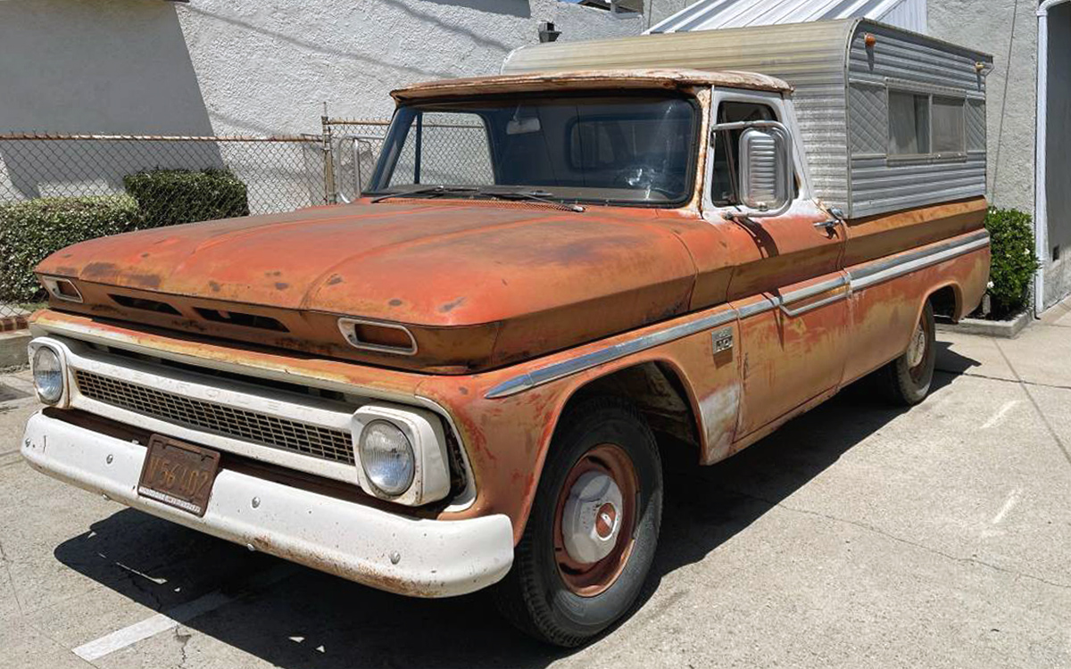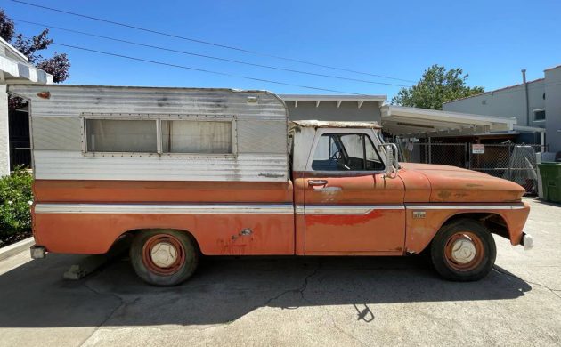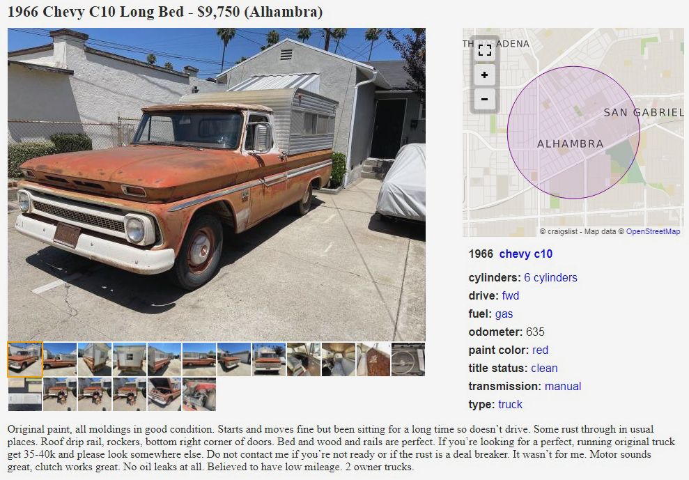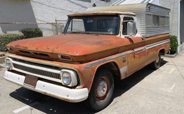The first-generation Chevy C/K-Series pickups were made for the 1960 through 1966 model years, and the 1966 pickups got a new, bigger six-cylinder engine. I believe this one should then be a 250-cu.in. OHV inline-six, as opposed to the former 230-six. This 250 should have 155 horsepower and 235 lb-ft of torque rolling through the optional 4-speed manual, sending power to the rear wheels. I know Bob_in_TN is somewhat of a vintage auto dealership scholar and I thought he’d get a kick out of seeing the original location of Barron Chevrolet, where this truck was sold new in 1966. It’s said to run fine, the clutch works fine, and there are no leaks, but don’t attempt to drive it home unless you live in Alhambra. Any thoughts on this ’66 C10 with topper/cap/shell? How much is it worth in this condition? The seller has it priced at a short-bed value.