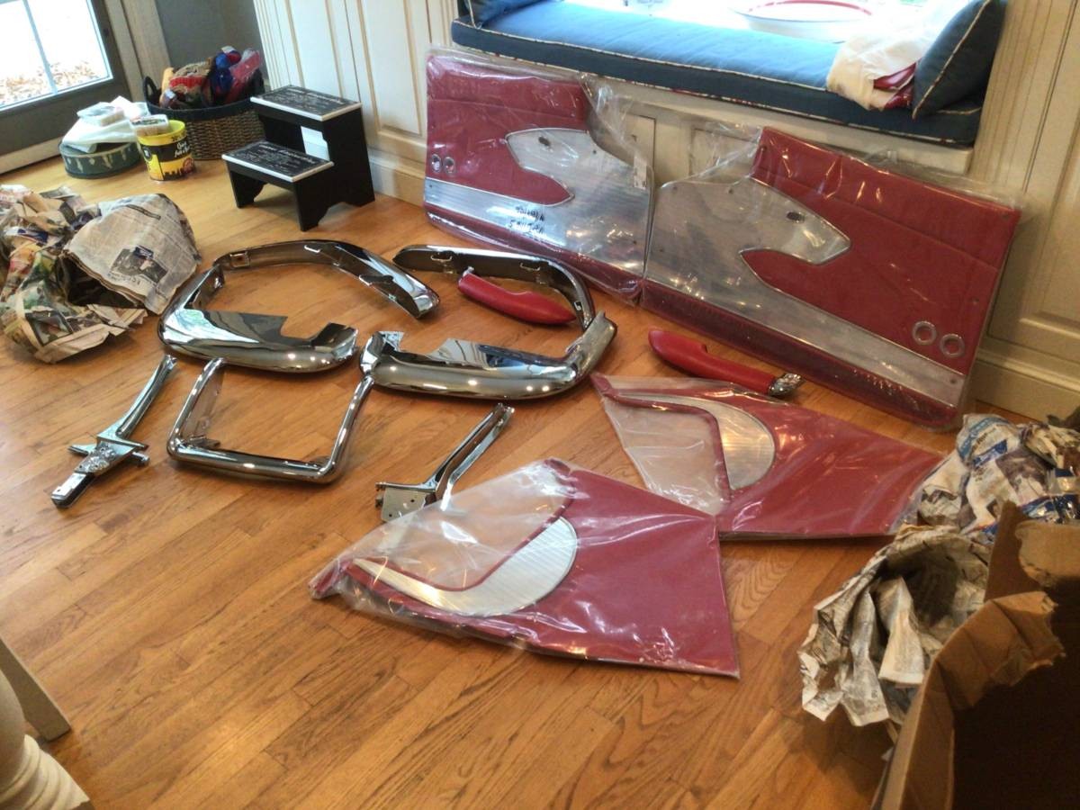 This photo shows us some of that glorious chrome and many of the new interior pieces the owner purchased for this project. If the buyer reapplies Roman Red to the exterior, the Red interior trim will look stunning. It seems that virtually everything is present to make the interior appear factory-fresh. It includes the seats, the upholstered pieces, a new dash pad, and a matching Red carpet set. Once the panels and paint are complete, dropping this lot into place should be a rewarding task for the buyer to undertake. There could be a few minor pieces that they will need to source, but what is there would break the back of this part of the restoration process.